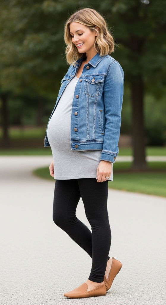 Combining a classic denim jacket with stretchy leggings creates an effortlessly chic look, ideal for expectant mothers seeking comfort without sacrificing style. The denim jacket, often made from lightweight cotton, offers a structured element with its fitted silhouette, while the leggings provide a snug fit that adapts to your growing belly. The contrast between the two pieces gives a balanced look, perfect for casual outings.