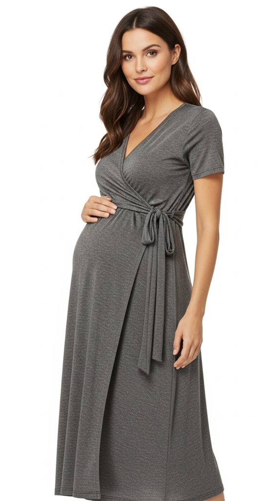 The wrap dress with an empire waist is a timeless choice that flatters all body types, especially during pregnancy. Crafted from soft, stretchy fabrics like jersey or cotton, the wrap dress accentuates the bust while providing a flowy silhouette that allows for comfort as your body changes. Available in various colors and prints, this dress offers both elegance and ease, making it suitable for both casual and formal settings.