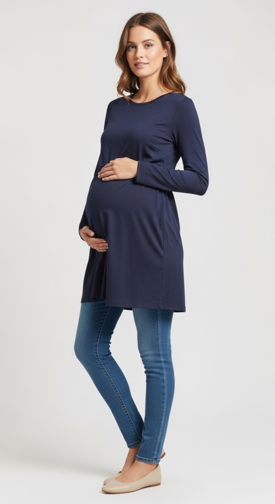 A chic tunic paired with skinny jeans creates a sophisticated yet relaxed look suitable for any pregnant woman. The tunic, often made from lightweight fabrics like cotton or viscose, drapes beautifully over the body, providing coverage while still being trendy. The skinny jeans, crafted from stretchy denim, hug the legs comfortably, creating a flattering silhouette that balances the volume of the tunic.