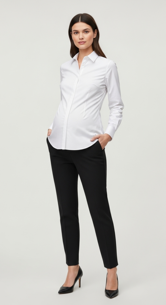 The classic white shirt worn with tailored trousers creates an elegant and sophisticated look that can easily transition from day to night. The shirt, made from crisp cotton or poplin, features a tailored fit that flatters the figure, while the tailored trousers, often made from stretchy materials, offer structure and comfort for a polished silhouette. This combination is a staple in any maternity wardrobe.