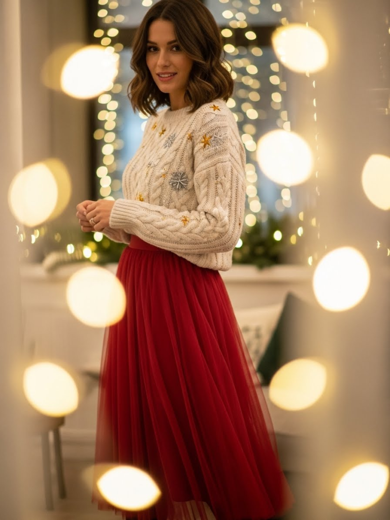 For a playful, feminine take on holiday dressing, a red tulle skirt paired with a festive sweater feels whimsical yet chic. The tulle brings volume and movement, creating a soft, romantic silhouette. The sweater adds warmth and balances the drama of the skirt, making the outfit wearable for a range of holiday parties. Whether you choose a subtle knit or a sweater with seasonal motifs, the look stays charming and approachable. Add heels or ballet flats to complete the ensemble.