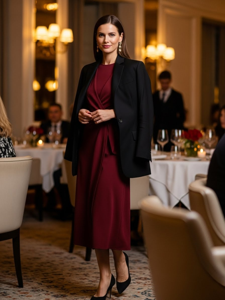 A burgundy midi dress brings rich seasonal color while remaining polished enough for a professional setting. Its flattering length makes it appropriate for both formal and semi-formal work dinners. Add a structured blazer to sharpen the look and create a refined silhouette that signals confidence. This pairing balances festive charm with business elegance, making it ideal for corporate events or team celebrations. Finish with pointed heels and understated gold jewelry for a clean, elevated aesthetic that fits seamlessly into any work-related gathering.
