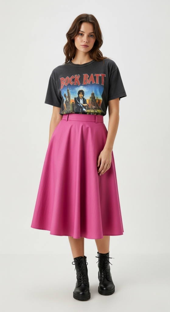 This outfit centers around a classic vintage band tee, made from soft cotton with a slightly faded print that adds character. Paired with a high-waisted skirt in a vibrant hue, the outfit balances casual and chic effortlessly. The silhouette is flattering, emphasizing the waist while allowing for comfort and movement. The juxtaposition of the rock-inspired tee with the feminine skirt creates an intriguing visual dynamic that captures attention.