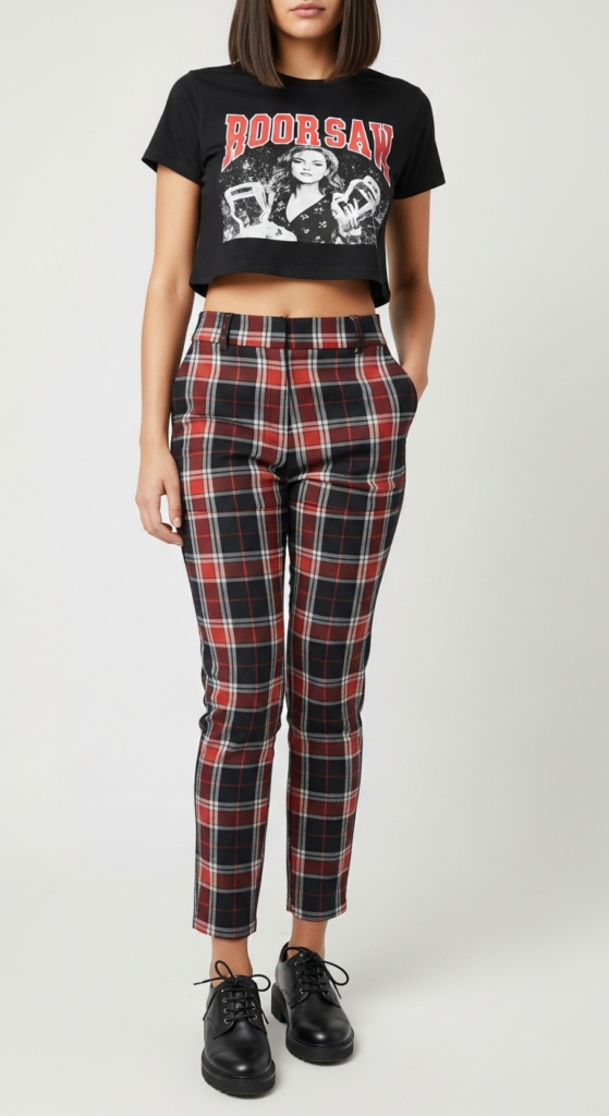 Plaid pants in a tailored fit are the centerpiece of this outfit, offering a sharp yet playful look. The bold pattern draws the eye, while the graphic crop top adds a youthful, casual edge. The combination of fitted pants and a looser top creates a balanced silhouette, making it stylish and approachable. The colors in the plaid can be mixed and matched with a variety of tops to suit personal taste.
