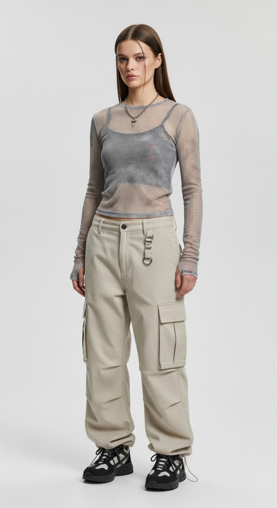 The foundation of this outfit consists of layered mesh tops that add depth and intrigue. The tops can vary in color and pattern, showcasing a fun, eclectic aesthetic. Paired with cargo pants in a neutral tone, the outfit achieves a balance between edgy and casual. The loose fit of the pants contrasts beautifully with the fitted nature of the mesh layers, creating a dynamic silhouette.