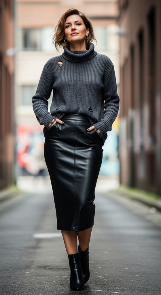 Starting with a sleek leather skirt that hugs the curves, this outfit showcases an edgy yet sophisticated aesthetic. The ripped turtleneck adds a touch of rebellion, infusing the look with a casual, laid-back vibe. The combination of textures—smooth leather against soft knitwear—creates a visually appealing contrast that captures attention and highlights individual style.