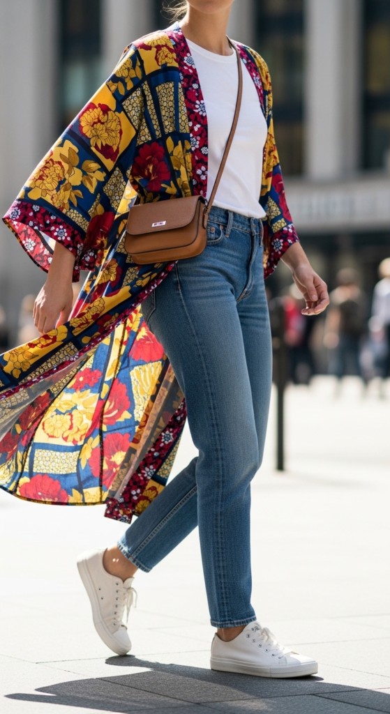 The printed kimono serves as a statement piece in this outfit, featuring bold patterns and flowing fabric that adds movement and flair. Layered over a basic tee, the ensemble strikes a balance between comfort and style. The lightweight nature of the kimono allows for easy layering while making the outfit feel breezy and relaxed.