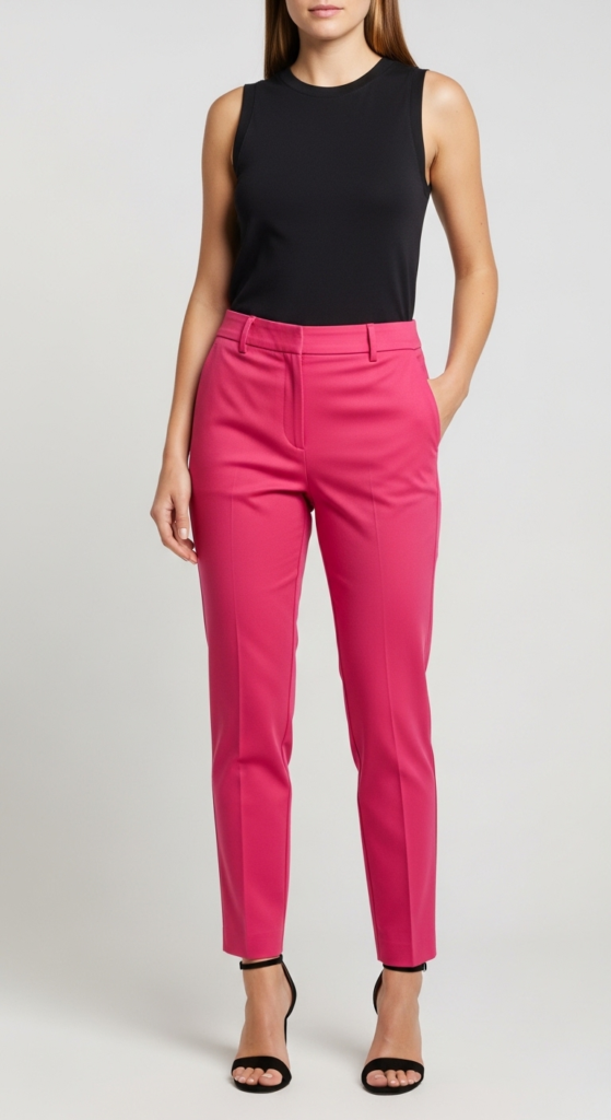 The brightly colored trousers make a bold statement, featuring a tailored fit that flatters the silhouette while adding a pop of color to any outfit. Paired with a simple black tank, this ensemble achieves a striking contrast that highlights the trousers’ vibrancy. The clean lines and tailored look create a polished yet fun appearance that is sure to turn heads.