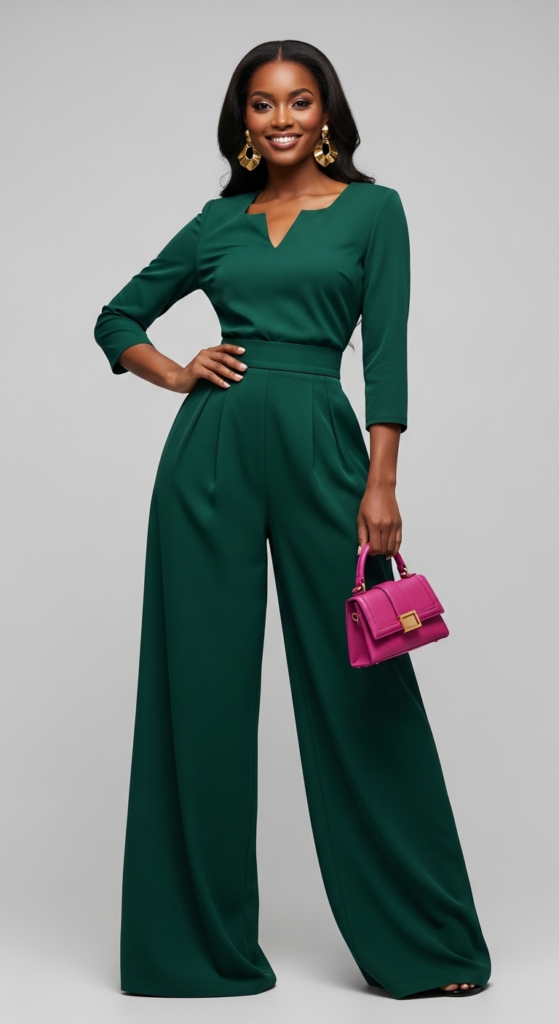 Creating a monochrome look involves selecting pieces in varying shades of the same color, which can create a sleek and sophisticated appearance. This outfit features a tailored top and wide-leg trousers in a deep shade, allowing the silhouette to flow elegantly. The cohesive color palette is elevated with bold accessories, such as statement earrings or a contrasting handbag.