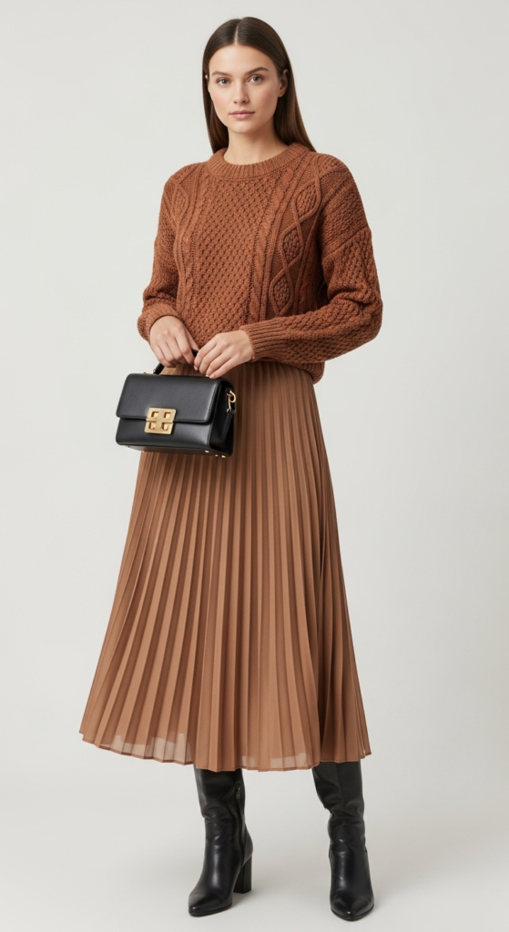 The textured sweater serves as a cozy yet stylish piece, featuring intricate knit patterns that add visual interest. Paired with a pleated midi skirt in a complementary color, the outfit achieves a beautiful balance between casual and elegant. The flow of the skirt contrasts with the structured nature of the sweater, creating a flattering silhouette that works for various occasions.