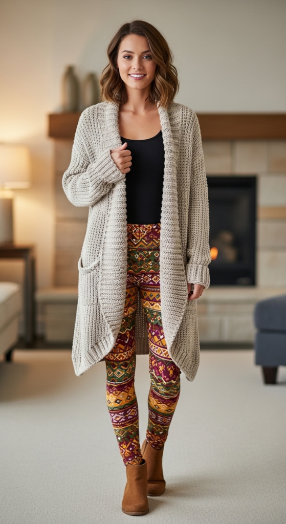 Starting with a long cardigan in a soft knit, this outfit offers an inviting and cozy aesthetic. The cardigan drapes beautifully, creating a relaxed silhouette that pairs well with patterned leggings, which add a fun twist to the ensemble. The combination of textures and patterns creates visual interest while ensuring comfort and ease of movement.