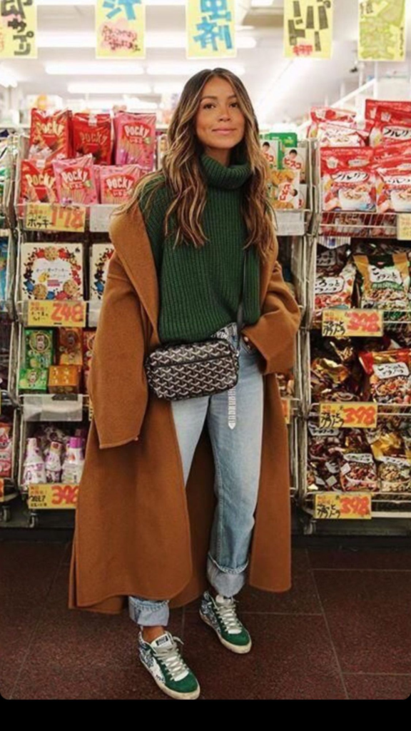 A chunky green turtleneck brings both texture and depth. The rich color adds interest against the neutral coat and keeps the outfit seasonally appropriate. Slightly relaxed denim keeps the look grounded and wearable, ideal for long walks, travel days, or casual city errands.