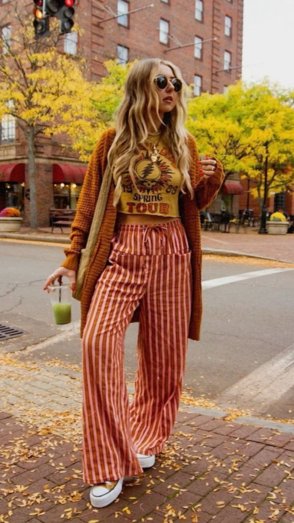 High-waisted striped trousers introduce movement and visual interest. The relaxed, wide-leg fit allows comfort while creating a flattering silhouette that works well for walking and daily activities. The warm color palette feels especially fitting for fall-to-winter transitions, blending effortlessly with the surroundings.
