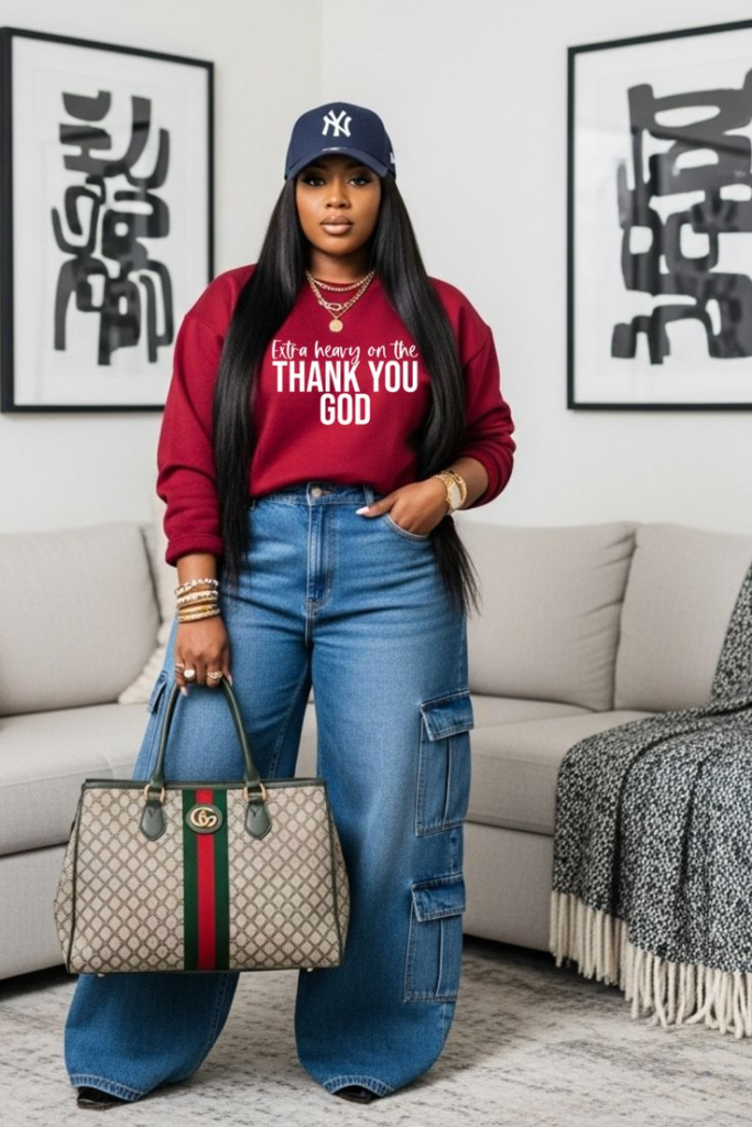 Wide-leg cargo denim brings structure and balance to the relaxed top. The utility-inspired details add interest and make the look feel modern and practical. The high-waisted fit creates a flattering shape while keeping the outfit comfortable for all-day wear, especially during colder months.