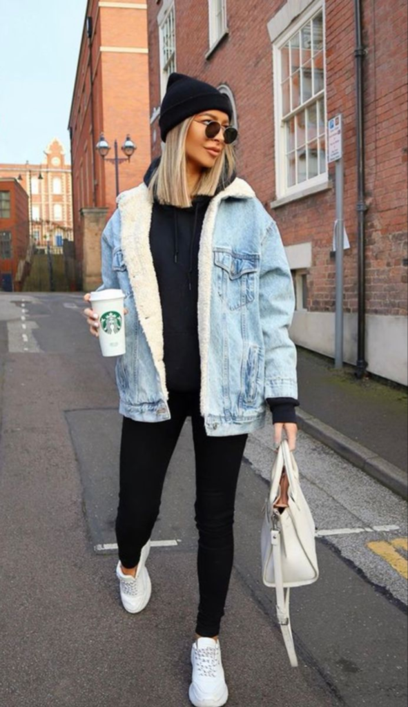 This outfit is a classic example of casual winter dressing that feels effortless yet intentional. The sherpa-lined denim jacket adds warmth and texture, making it a reliable outer layer for cold days without feeling heavy. The light wash keeps the look fresh and prevents the outfit from feeling too dark or bulky.