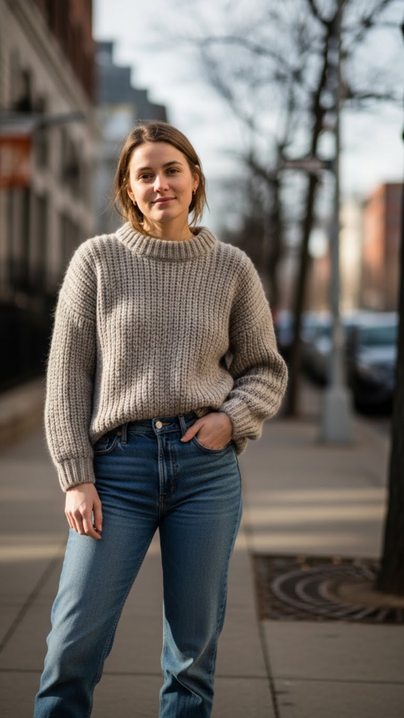 Soft knits instantly bring a cozy feel, especially when balanced with structured denim. The contrast between a slouchy top and clean-cut jeans helps maintain shape, making the outfit suitable for casual outings, travel days, or low-key meetups.
