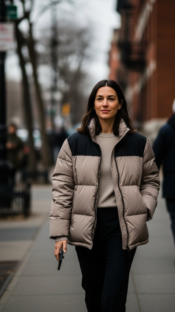 This outfit suits cold outdoor conditions while still looking modern and wearable. The padded texture of the jacket adds visual interest, making even minimal outfits feel intentional. Slim jeans or leggings help offset the volume on top.