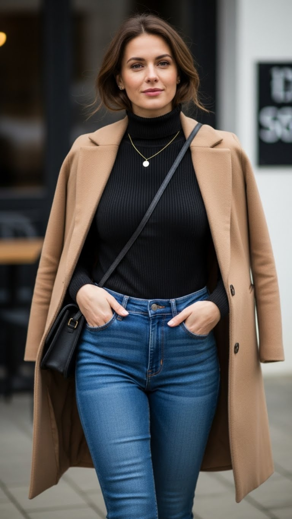 Playing with layer lengths adds depth. A longer coat over a fitted turtleneck creates a flattering vertical line, perfect for everyday wear or casual workdays.