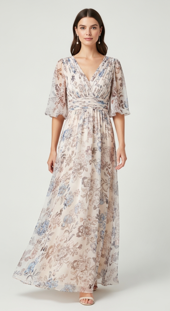 To style the elegant maxi dress, consider pairing it with strappy nude sandals that elongate the legs while keeping the look airy. A wide-brimmed hat adds a chic touch, perfect for outdoor events. Opt for subtle jewelry, such as stud earrings or a delicate bracelet, to maintain the dress’s elegance. This outfit is suitable for daytime events, and layering with a light denim jacket can transition it into evening wear effortlessly.