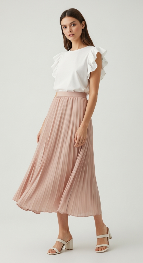 The flowy midi skirt paired with a blouse strikes a perfect balance between casual and sophisticated. The skirt, made from a lightweight crepe fabric, features a high waist and pleats that create movement with every step. Its soft blush color is both feminine and versatile, easily paired with various tops. The blouse, made from breathable cotton, has delicate ruffled sleeves and a relaxed fit, complementing the skirt’s silhouette beautifully.