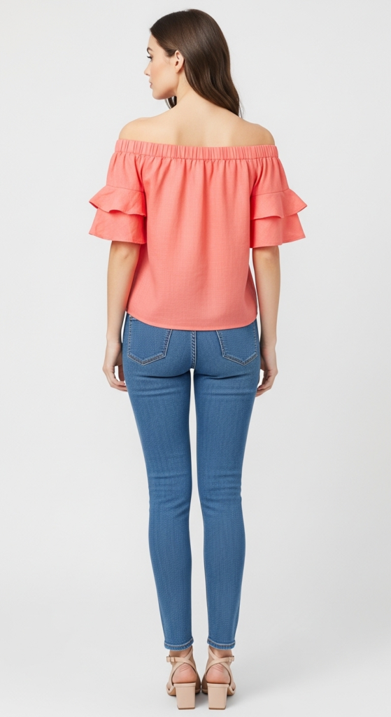 The stylish off-shoulder top paired with jeans creates a laid-back yet chic look perfect for casual outings. The top, crafted from lightweight linen, features ruffled sleeves that add a playful touch while showcasing the shoulders. Its vibrant coral color stands out, making it a focal point of the outfit. The fitted jeans, made from stretchy denim, provide a balanced silhouette, ensuring comfort and style for everyday wear.