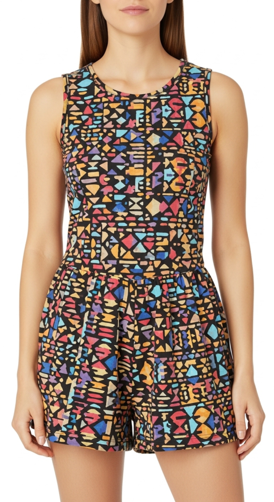 The trendy romper is a playful yet stylish option for those looking to stand out. Made from a blend of cotton and spandex, it features a fitted bodice and flared shorts that offer freedom of movement. The bold geometric print in vibrant colors adds a fun flair, making it a statement piece for summer outings. The elastic waist ensures a flattering fit, accentuating the figure while maintaining comfort.