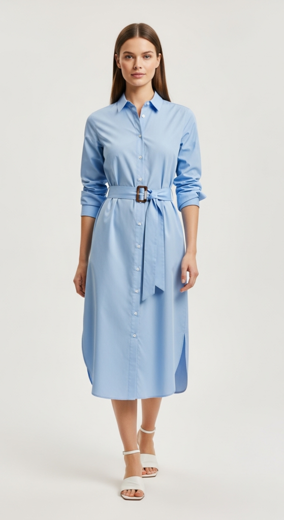 To style the shirt dress, consider pairing it with white sneakers for a relaxed, sporty look or opt for ankle boots for a more polished finish. A crossbody bag can add practicality while maintaining the ensemble’s laid-back vibe. This outfit is perfect for brunch with friends or casual Fridays at the office, and layering with a tailored blazer can transition it into a more formal setting. Minimalist jewelry can enhance the look without overwhelming it.