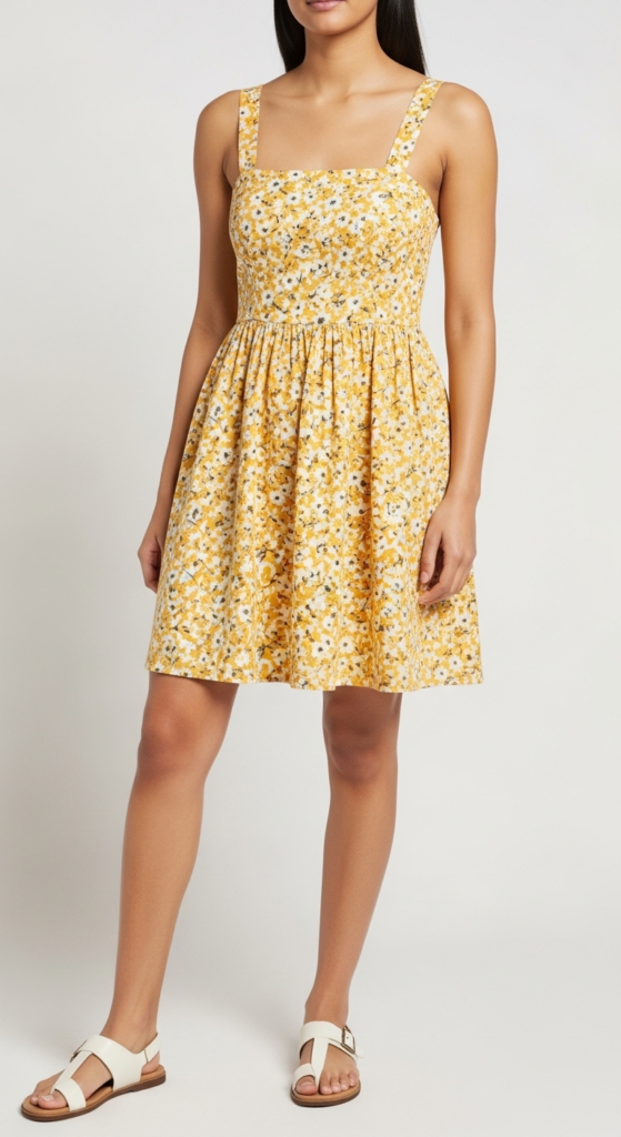 The breezy sundress is perfect for warm days, offering both comfort and style. Made from lightweight cotton, it features a fitted bodice and a flared skirt that hits just above the knee. The dress is available in a cheerful yellow floral print, bringing a touch of sunshine to any occasion. The adjustable straps allow for a customized fit, ensuring it flatters all body types while keeping it casual and fun.