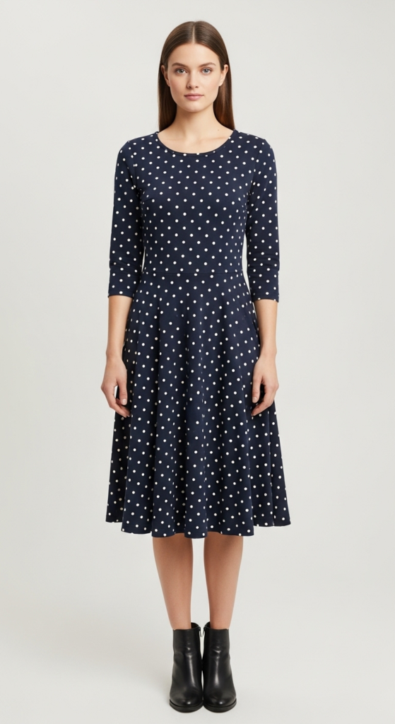 The fashionable A-line dress is a versatile piece that flatters many body shapes. Constructed from a soft blend of cotton and polyester, it features a fitted bodice and a gently flared skirt that falls just below the knee. The classic navy blue color is timeless and works well for various occasions, while the subtle white polka dots add a playful touch. This combination of elements makes it ideal for both casual and semi-formal events.