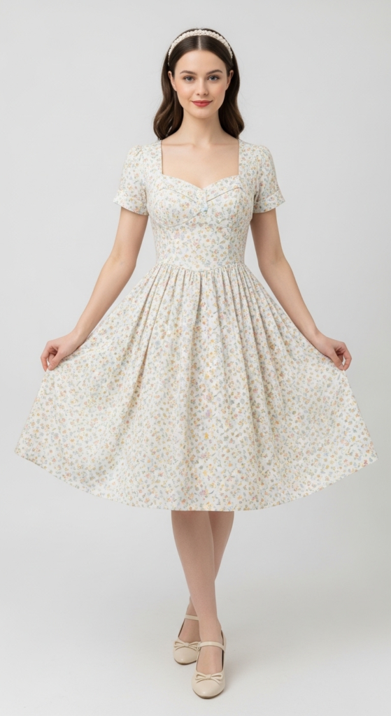 To style the tea dress, consider pairing it with T-strap heels that enhance the vintage aesthetic while providing comfort. A small handbag with a vintage flair can complement the look, and adding a string of pearls can elevate the outfit for more formal occasions. This ensemble is perfect for afternoon tea or garden parties, and a light cardigan can provide warmth for cooler evenings. Opt for soft, natural makeup to maintain the classic vibe.
