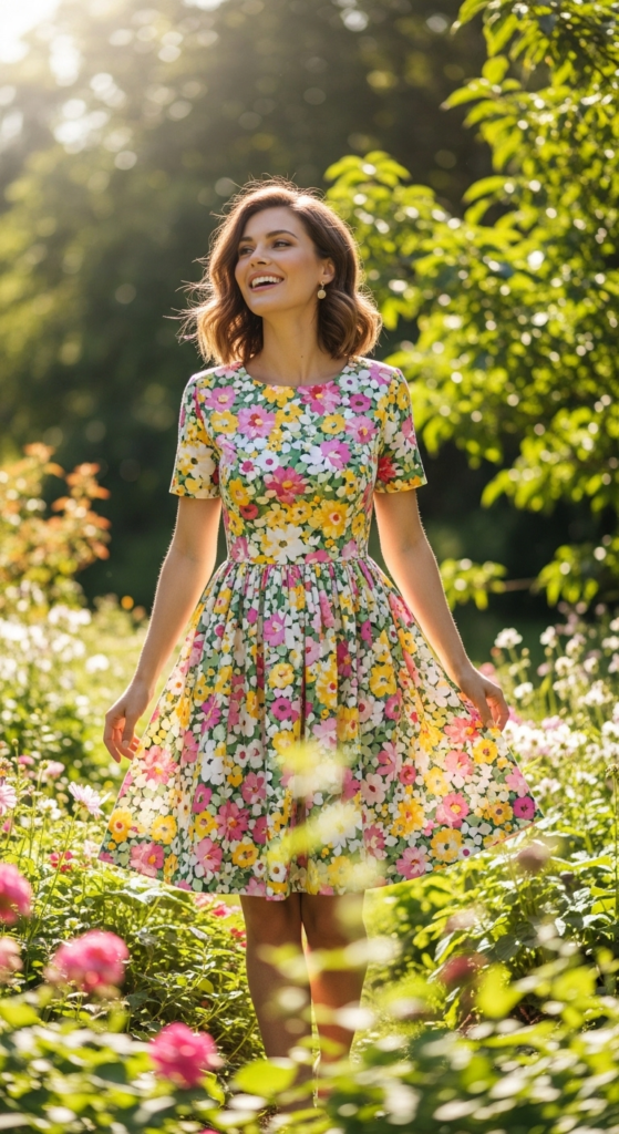 The playful floral dress is a delightful choice for spring and summer occasions, combining whimsy with femininity. Made from lightweight cotton, it features a fitted bodice and a flared skirt that creates a flattering silhouette. The vibrant floral print in shades of pink, yellow, and green adds a cheerful touch, making it perfect for outdoor gatherings or casual outings.