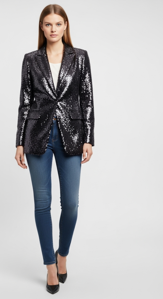 8. Sequined Blazer and Skinny Jeans