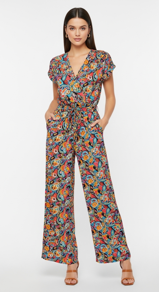 To style this look, opt for chunky heels or platform sandals to elongate the legs and enhance the overall retro aesthetic. Accessories can include oversized earrings and a statement belt to accentuate the waist. Ideal for summer parties, festivals, or even casual daytime events, this outfit allows for easy movement while keeping you stylish. A light denim jacket can be layered over the jumpsuit during cooler evenings, adding versatility to your look.