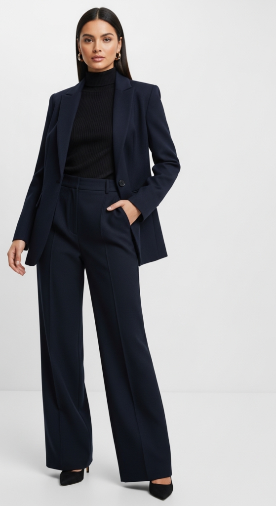 The chic power suit is a quintessential piece that embodies confidence and sophistication. This ensemble features a tailored blazer in a rich navy hue, crafted from a luxurious wool blend that offers both warmth and structure. Paired with high-waisted, wide-leg trousers, this outfit creates a flattering silhouette that elongates the legs and accentuates the waist. The sharp lines and fitted design exude professionalism while retaining an air of femininity.