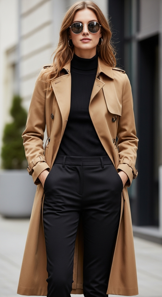 The tailored trench coat look is a timeless classic that combines functionality with high fashion. Featuring a fitted camel trench coat made from a soft cotton blend, this outfit offers both warmth and style. Underneath, a simple black turtleneck and fitted trousers create a streamlined silhouette that is both chic and sophisticated. The coat’s cinched waist adds definition, making it a flattering choice for various body types.