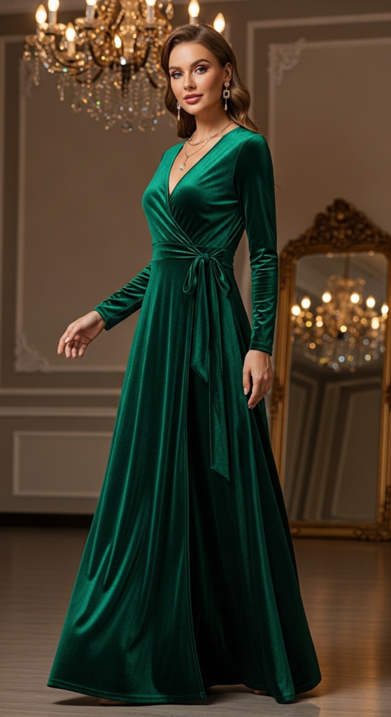 The velvet wrap dress is the epitome of elegance, showcasing a sumptuous fabric that drapes beautifully. This dress features a deep emerald hue, complemented by a flattering wrap design that accentuates the waist while creating a flowing silhouette. The soft texture of the velvet adds depth and luxury, making it an ideal choice for evening events or special occasions.