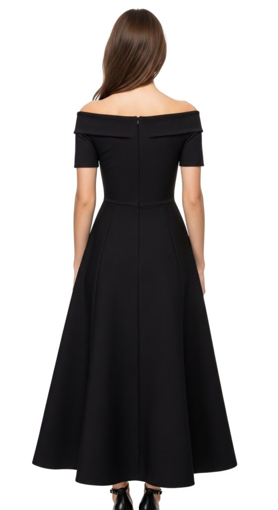The classic little black dress is a must-have in any fashionista’s wardrobe, serving as the foundation for countless stylish looks. This particular piece features a fitted bodice with a flared skirt, crafted from a luxurious stretch fabric that hugs the body in all the right places. The timeless design is enhanced by a subtle off-the-shoulder neckline, adding a touch of elegance to the iconic silhouette.