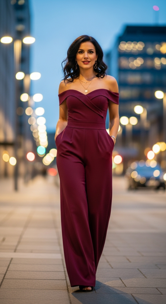 The off-shoulder jumpsuit is a bold and modern choice that exudes confidence and elegance. Featuring a fitted bodice with an off-the-shoulder neckline, this jumpsuit showcases a flattering silhouette in a rich burgundy hue. The wide-leg pants add movement and drama, allowing for an effortlessly chic appearance that is both stylish and comfortable.