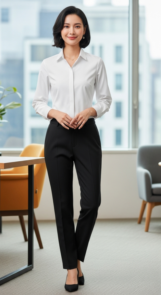 For styling, opt for pointed-toe flats or low heels to maintain a sophisticated appearance. A structured handbag and delicate jewelry can add subtle elegance to the outfit. This look is perfect for office settings, business meetings, or formal events, ensuring you exude confidence and poise in any situation.