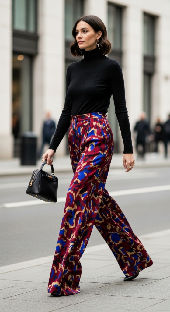 The stylish turtleneck with palazzo pants is a contemporary outfit that combines comfort with high fashion. This look features a fitted black turtleneck crafted from a soft knit, paired with wide-leg palazzo pants in a bold print. The flowy silhouette of the pants contrasts beautifully with the fitted top, creating a balanced and flattering effect.