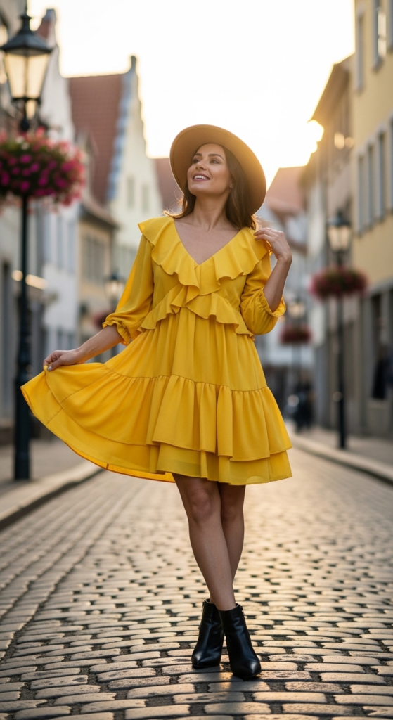 The ruffled dress with ankle boots is a playful choice that brings a fun and flirty vibe to your wardrobe. This outfit features a vibrant, tiered ruffled dress in a sunny yellow hue, crafted from lightweight fabric that flows gracefully. The flirty ruffles and short hemline create a youthful silhouette that is both stylish and comfortable.