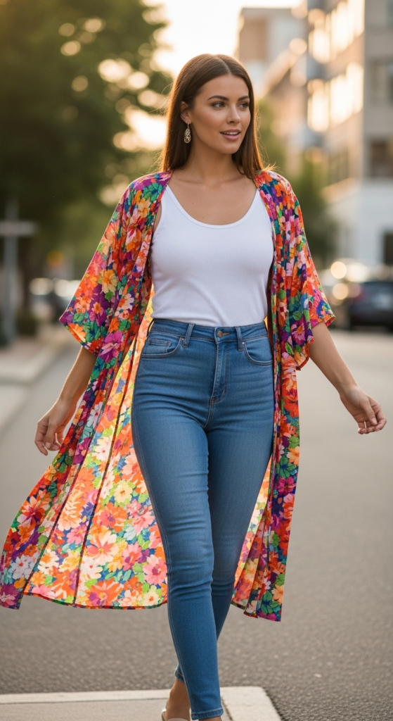 The bold printed kimono with jeans is a trendy choice that adds a touch of bohemian flair to any outfit. This ensemble features a flowing kimono with a vibrant floral print, made from lightweight fabric that drapes beautifully over the body. Paired with high-waisted skinny jeans, this outfit balances comfort with style, allowing for a relaxed yet chic look.
