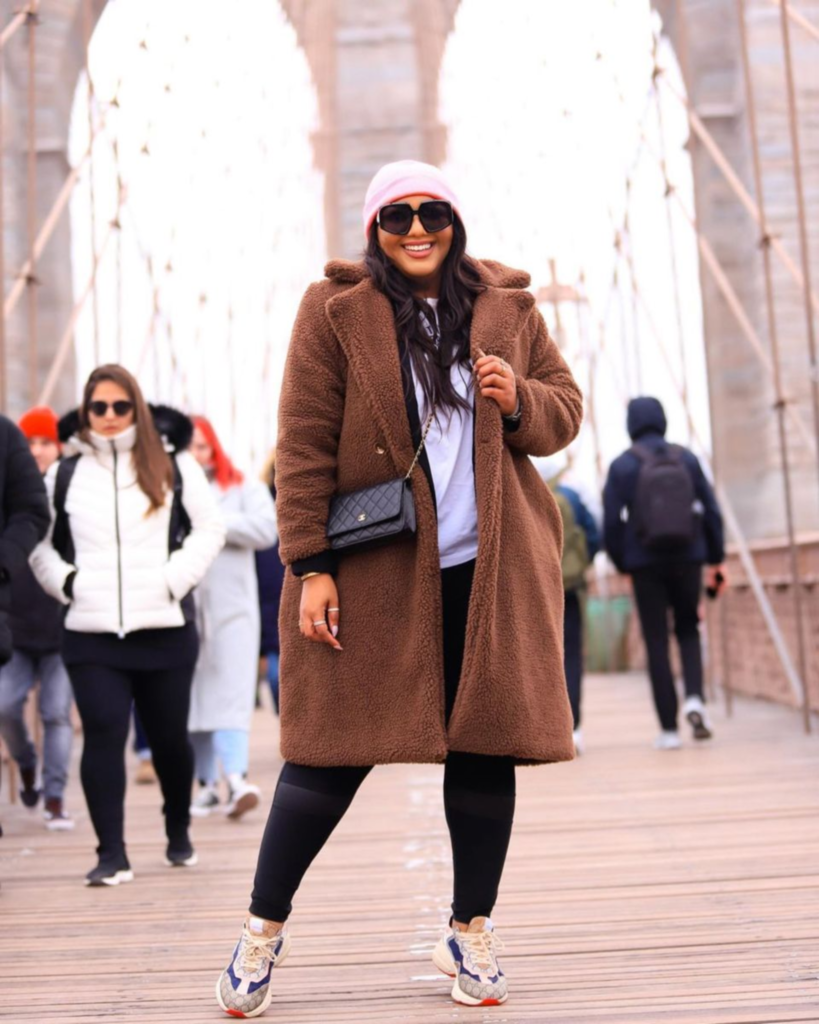 Black leggings ground the look and provide comfort for long walks, while also balancing the volume of the coat. The athleisure-inspired sneakers add a modern, on-the-go feel that works perfectly for busy winter days. Accessories like oversized sunglasses, a beanie, and a compact crossbody bag pull the outfit together without overwhelming it.
