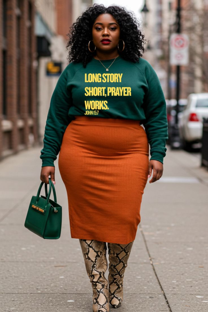 This outfit blends confidence, warmth, and statement styling in a way that feels bold yet wearable. A graphic sweatshirt brings personality to winter dressing while offering comfort and coverage. The relaxed fit balances beautifully with the ribbed midi skirt, which hugs curves smoothly and creates a strong, feminine silhouette.