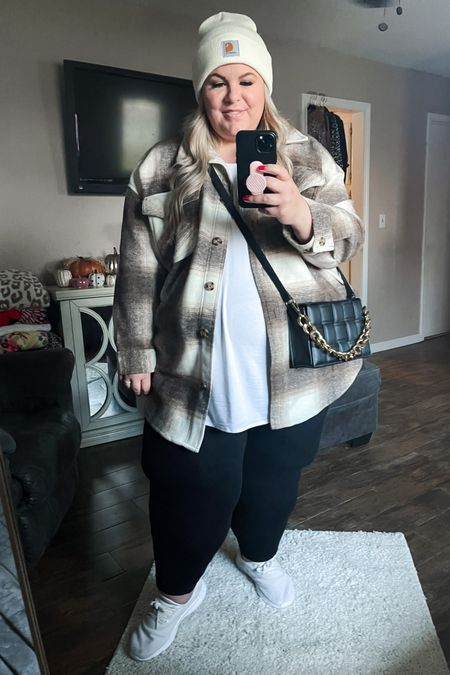 The outfit is all about comfort-first winter styling that still feels put-together. A plaid shacket acts as the perfect middle layer—thicker than a shirt, lighter than a coat—making it ideal for cold but manageable winter days. The neutral tones keep the look versatile, while the structured buttons and collar add shape and polish.