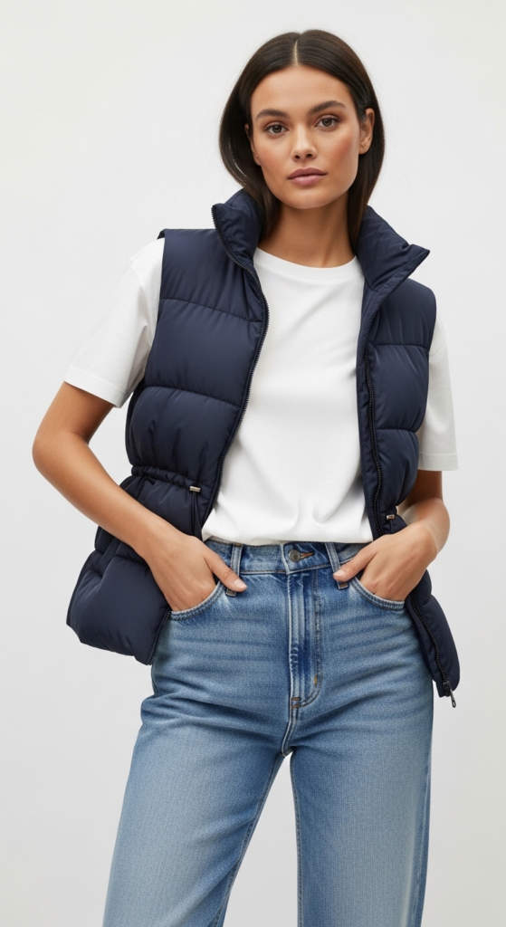 This outfit features a navy blue puffer vest layered over a classic white crew-neck t-shirt, paired with high-waisted straight-leg jeans in a light wash. The vest, crafted from a lightweight nylon material with a subtle sheen, cinches at the waist to create a flattering silhouette that contours the body while providing warmth. The overall look is a perfect blend of casual and chic, making it ideal for a day out or a casual work setting.