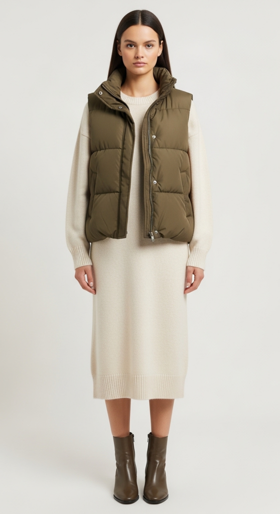 This outfit showcases a cozy cream-colored sweater dress paired with a fitted olive green puffer vest. The vest adds a layer of texture and warmth, while the dress, made from a soft acrylic blend, falls just above the knee, creating a relaxed yet sophisticated look. The combination of the fitted vest and the flowy dress creates a beautiful balance between structure and softness, making it visually appealing.