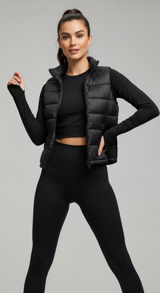 This ensemble features a sleek black puffer vest worn over a fitted long-sleeve athletic top and paired with high-waisted black leggings. The vest, made from breathable polyester, offers a sporty yet stylish silhouette, allowing for ease of movement. The monochromatic palette creates a streamlined look that is flattering and perfect for active pursuits or casual outings.