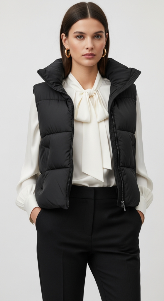 In this outfit, a tailored black puffer vest is layered over a crisp white silk blouse, complemented by fitted black trousers. The vest’s structured design adds a contemporary edge while maintaining a professional appearance. The contrast between the luxurious fabric of the blouse and the practical nature of the vest creates a sophisticated look that is perfect for the workplace.