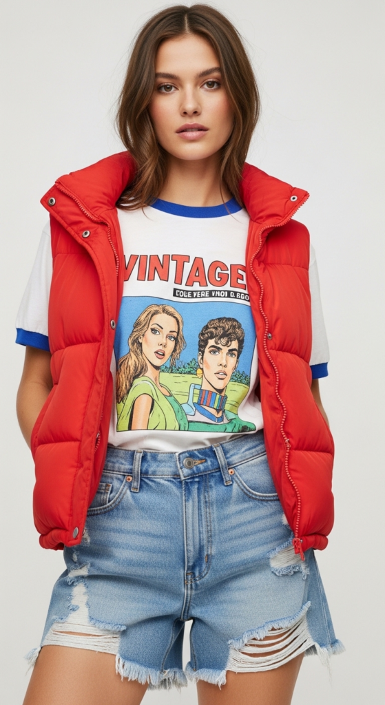 A playful graphic tee featuring a vintage print takes center stage in this casual outfit, layered with a vibrant red puffer vest. Paired with distressed denim shorts, this look is ideal for a laid-back weekend. The vest not only adds warmth but also a pop of color that makes the ensemble fun and youthful, perfect for expressing individuality.